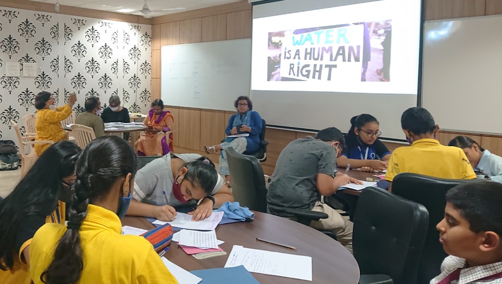 Through the activities and discussions in different topics in this module on Shared Waters, students will learn what the human right to water implies and challenges with access to water and sanitation including gender and caste-based discrimination. They will look at how public access to water or water for all through hydro-philanthropic efforts in the past have changed over time with the commodification of water and how organisations such as the Pani Haq Samiti in Mumbai are responding. Students will get a chance to reflect on how they can participate in ensuring equitable water access through action and the arts.